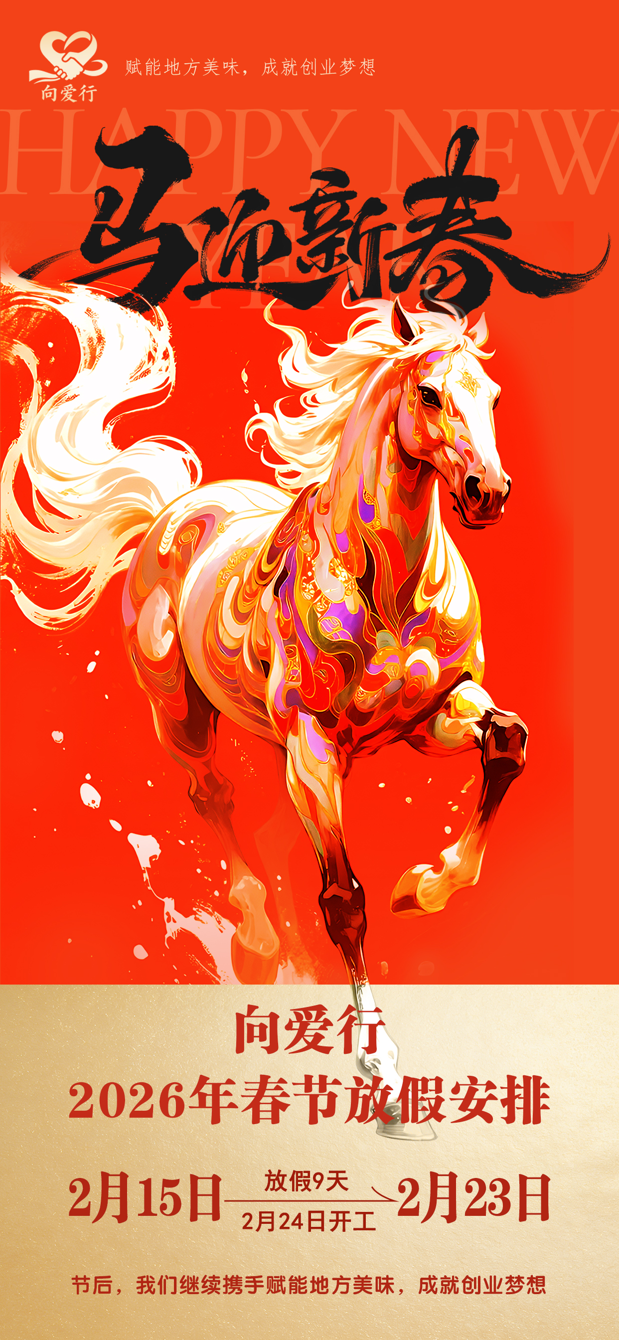 岁末将至,向爱行(河北)文化传媒有限公司将于2月15日(腊月廿八)至2月23日(正月初七)进入春节假期,2月24日(正月初八)正式开工。